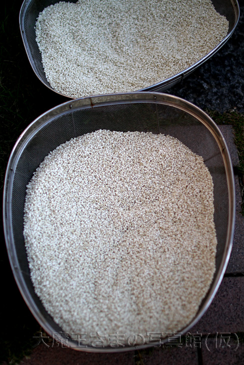 貰い物のもち米を日光に晒して、 単焦点♪