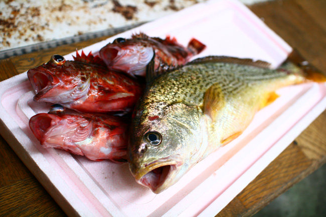 手前: コイチ [硬骨魚綱 スズキ目 ニベ科 ニベ属]後方: カサゴ [硬骨魚綱 カサゴ目 フサカサゴ科 カサゴ属]