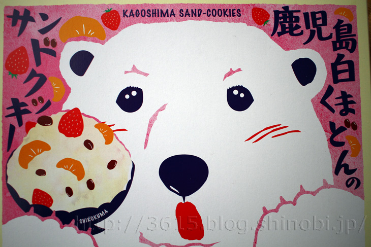 大きな声では申せませんが・・・◇◆ 鹿児島白くまどんのサンドクッキー ◆◇ミルク味のチョコレートに、いちご・オレンジピール・小豆・コーンフレークを練り込み、ミルククッキーでサンドしました。 鹿児島名物・氷白熊をイメージした味わいで、ザクっとした食感も特徴です。 愛嬌たっぷりのシロクマが描かれたパッケージもポイント。 (※2016年7月現在の情報です。 予告なく販売を終了したり、内容が変更になる場合がございますので、予めご了承ください。)--- えきマチ1丁目 鹿児島 より 抜粋 ---