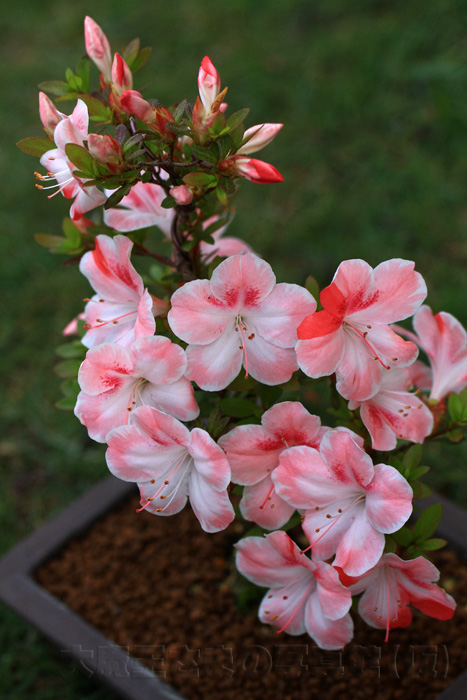 サツキ(皐月、学名 Rhododendron indicum)はツツジ科の植物で、山奥の岩肌などに自生する。 盆栽などで親しまれている。 サツキツツジ(皐月躑躅)などとも呼ばれており、他のツツジに比べ一ヶ月程度遅い、旧暦の5月 (皐月) の頃に一斉に咲き揃うところからその名が付いたと言われる。今年も お義父さんが持って来てくれました。--- ウィキペディアより抜粋 ---