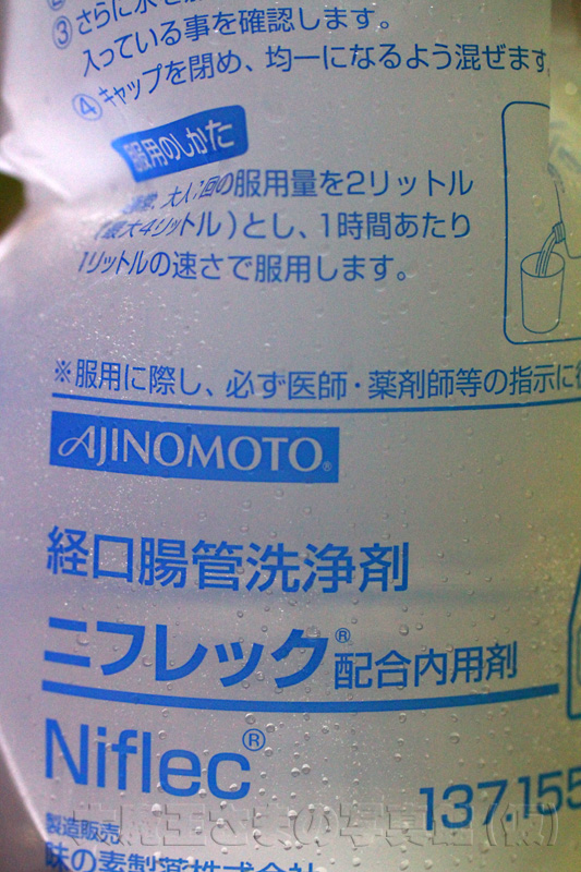 通常2L程度を使用するが、その全量を適宜分割して2時間程度の時間をかけて経口投与する。一日の最大使用量は4Lとされている。そして腸内の固形物を効率よく洗浄するために最初の500mL程度はゆっくりと飲むことが指示される。投与開始1時間ほどで肛門からの排泄が始まるが、その時点でも経口投与は継続する。排泄される液は当初は腸管内の固形物や濁りを含むが、排泄が進むにつれて澄明になり最終的には胆汁由来の着色(黄色)が認められる透明な液体が排泄されると腸内洗浄は十分である。液が残存すると内視鏡検査等の障害となるので腸管洗浄剤の排泄が完了してから検査あるいは手術に臨むことになる。飲みやすくする為に・・・--- ウィキペディアより 抜粋 ---